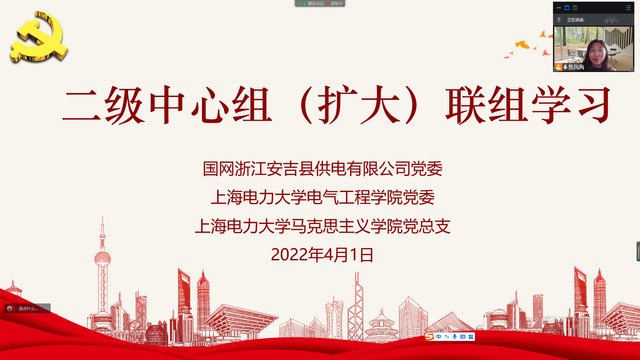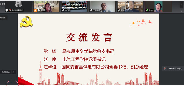 4月1日下午,马克思主义学院党总支、金沙党委与国网浙江安吉供电有限公司党委,联合开展线上二级中心组(扩大)联组学习。会议特邀华东师范大学马克思主义学院丁晓强教授,做《党的创建与伟大建党精神》主题讲座。国网浙江安吉供电有限公司总经理、党委副书记石勇,党委书记、副总经理汪卓俊,金沙党委书记赵玲,党委副书记、院长李东东,马克思主义学院党总支书记常华,常务副院长、党总支副书记焦凤梅等出席会议,马克思主义学院全体思政课教师参与学习。焦凤梅主持学习。