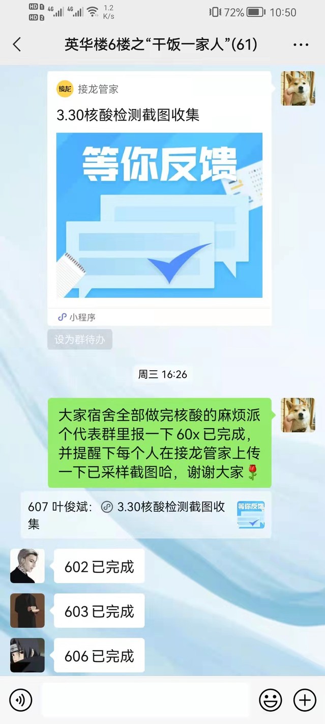 “具体问题具体分析”是马克思主义活的灵魂。作为坚定的马克思主义者,叶俊斌同志在工作中注重化解工作效率与工作质量之间的矛盾,结合具体的工作需要和工作背景制定具体的工作方案。如对于疫情期间的常态化核酸检测工作,在前期摸索和辅导员老师的指导下,已逐步形成了“寝室代表报告+全员截图核实”的协同优化工作模式。一方面,发挥“寝室代表报告”模式的高效性,避免长时间等待全员截图对未检测人员的提醒时机造成延误,保证工作效率;另一方面,发挥“全员截图核实”的全面性,避免报告情况因各种原因存在遗漏,保证工作质量。与此同时,在“楼层为先锋,班级为保障”的联动工作模式下,积极通过楼层长间的互通,对楼层与班级交叉事务进行适当调整和优化,以班级为渠道对核酸检测全面性做进一步保障。