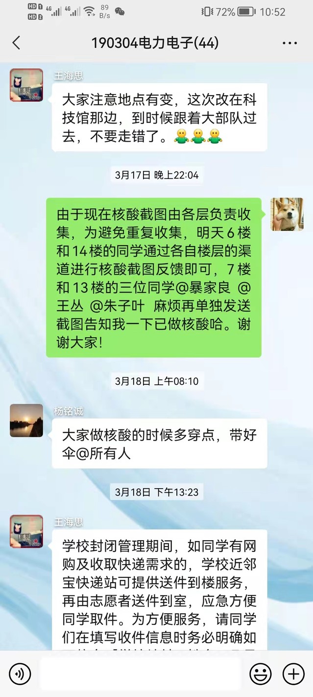 3月14日晚8点整,我校杨浦校区正式启动校园封闭措施,全员进入“7+7”健康管理阶段。在辅导员王海思老师的统一指导和部署下,叶俊斌同志被紧急任命为英华楼6层负责人,原作为班级团支书的他在确认好班级同学均已回到寝室后立即转变工作角色,第一时间前往英华楼6层各寝室进行情况通报,组建楼层沟通平台、建立师生沟通渠道,同时迅速投入工作状态,通过“线上+线下”联动的方式连夜组织楼层参加核酸检测。