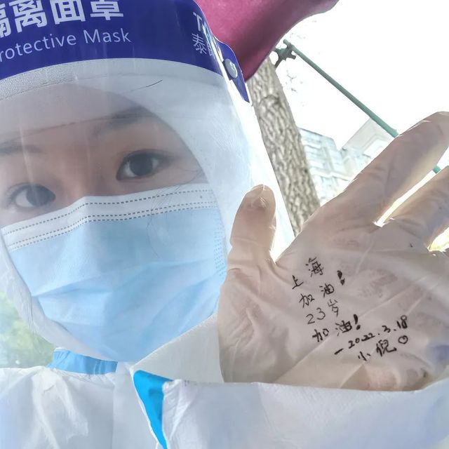 3月18日当天,工作结束后,她拿起笔在自己的防疫手套上写上了:“上海,加油! 23岁,加油!”还在社交平台上分享了自己的心情,她坦言: “疫情需要我时,我成为了光荣的志愿者,这是我长这么大,过的最有意义的一个生日了 。