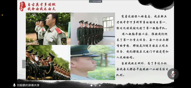 刘毅鹏讲到,“正因为见识到了大城市的好,才更想去建设好我的家乡,2008年的凝冻灾害导致贵州大面积的断电,只有那一个个电力工人逆行在山与山之间,为我们守卫万家灯火,这一幕我始终历历在目,我从小就励志要像他们一样默默的守护着我的家乡”。一直以来,他践行着“一朝是军人,一辈子是军人”的铮铮誓言,表示会将“为人民服务”的事情一直做下去。