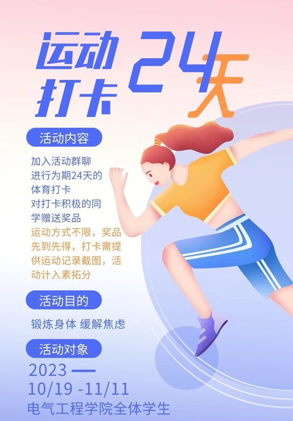 为引导同学们关注身体健康,提倡运动的同时释放心理压力。金沙心理协会于10月19日至11月11日举办一场别开生面的活动——“24天运动打卡”。本次活动通过显示线上打卡线下自行进行体育锻炼的形式,让同学们积极参与到体育锻炼中,在锻炼的同时缓解焦虑。