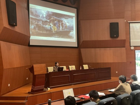 接着,支部书记曲家瑶进行了《图说党的二十大——美术经典中的百年风》主题讲座,通过对中国近现代各种山水画、雕塑、油画作品的讲解,指出近现代中国革命运动和中国共产党的发展过程。在讲解《启航——中共一大会议》这幅画时,曲老师说:“这是一艘小小的红船,越过急流险滩,穿过惊涛骇浪,成为领导中国,行稳致远的巍巍巨轮,胸怀千秋伟业,恰是百年风华。”以红船比作中国共产党,突出共产党的先进性、革命性,让人眼前一亮。在讲解《开荒牛》雕塑作品时,曲老师说它代表着深圳改革开放,不断向前,脚踏实地的时代精神。在讲解《西电东送 西气东输》这幅作品时,曲老师通过这幅画介绍了这两项超级工程背后鲜为人知的故事,以及他们的建设过程。讲座的最后,曲老师鼓励学员们多多阅读与党相关的书籍画作,在艺术作品中领悟党的精神,丰富自己的思想内涵,加深对中国共产党的理解,不忘初心,砥砺前行。
