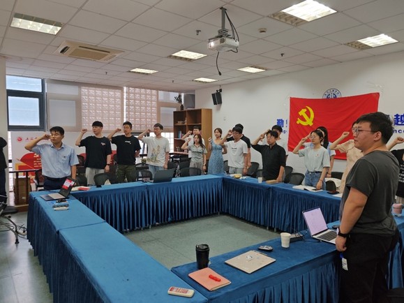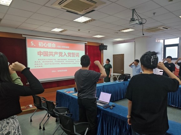在重温入党誓词宣誓环节,支部书记王海思带领大家举手右手宣誓,重温入党时的初心和使命。铿锵有力的誓词在会场上回荡,激发了支部党员的荣誉感和责任感。